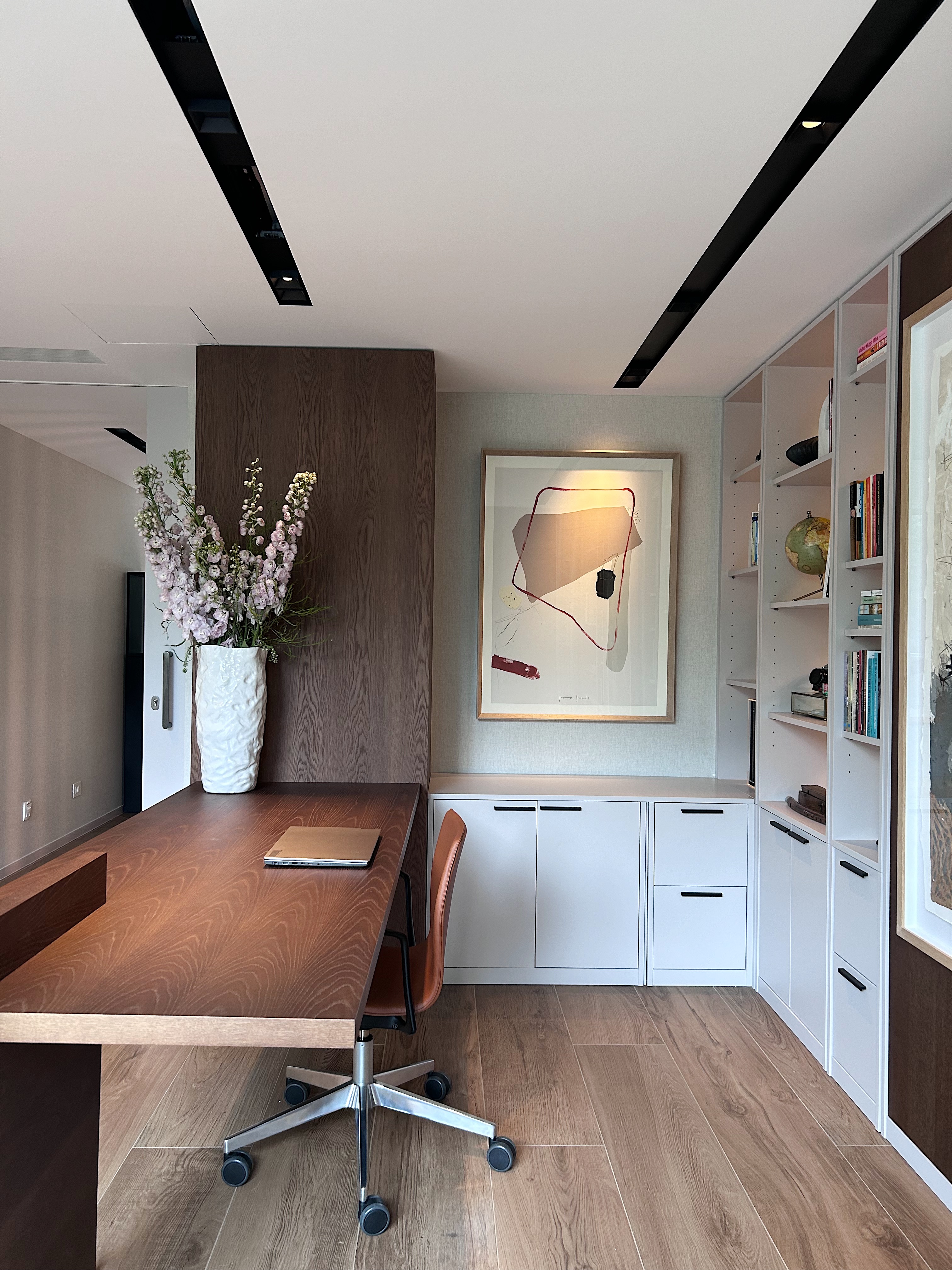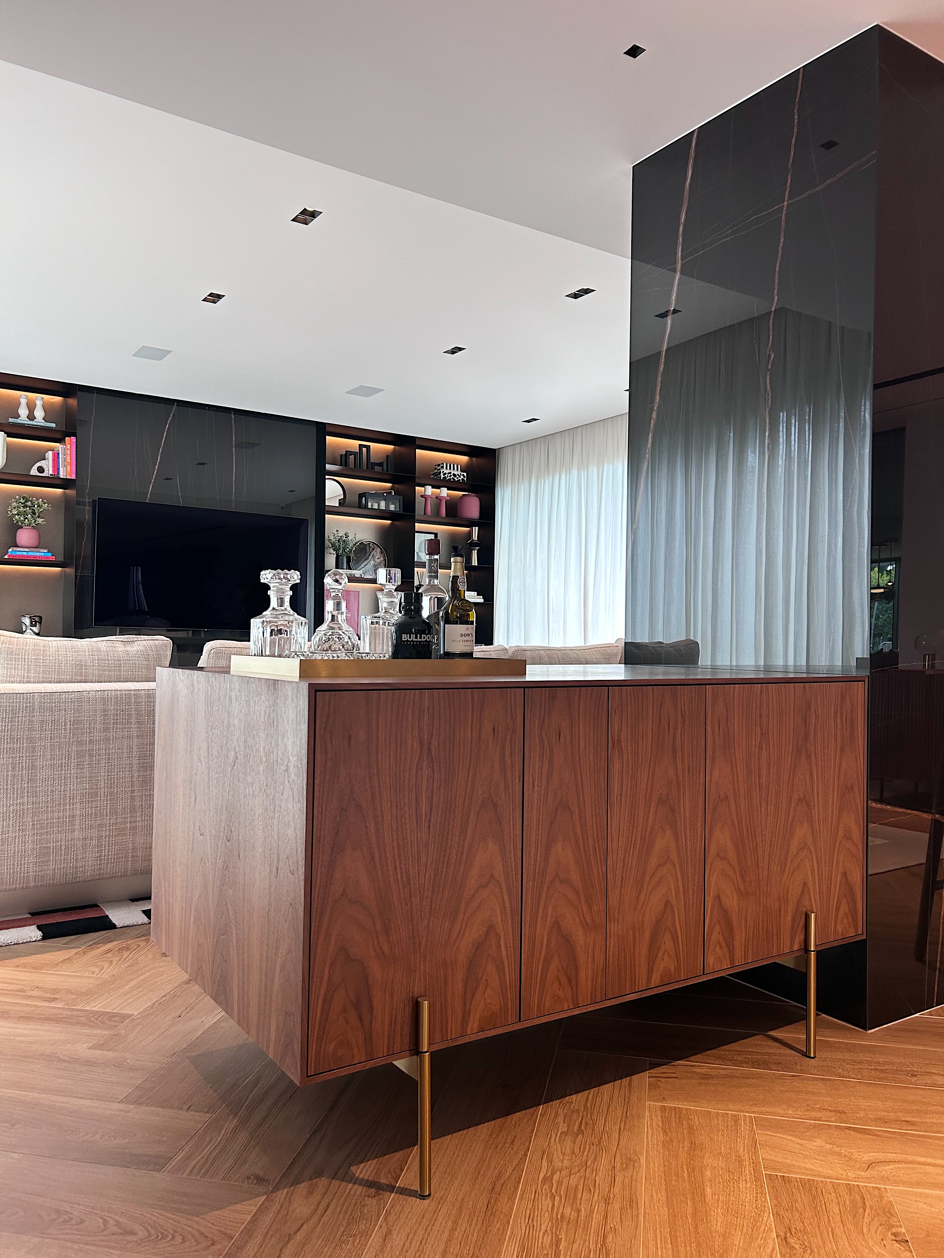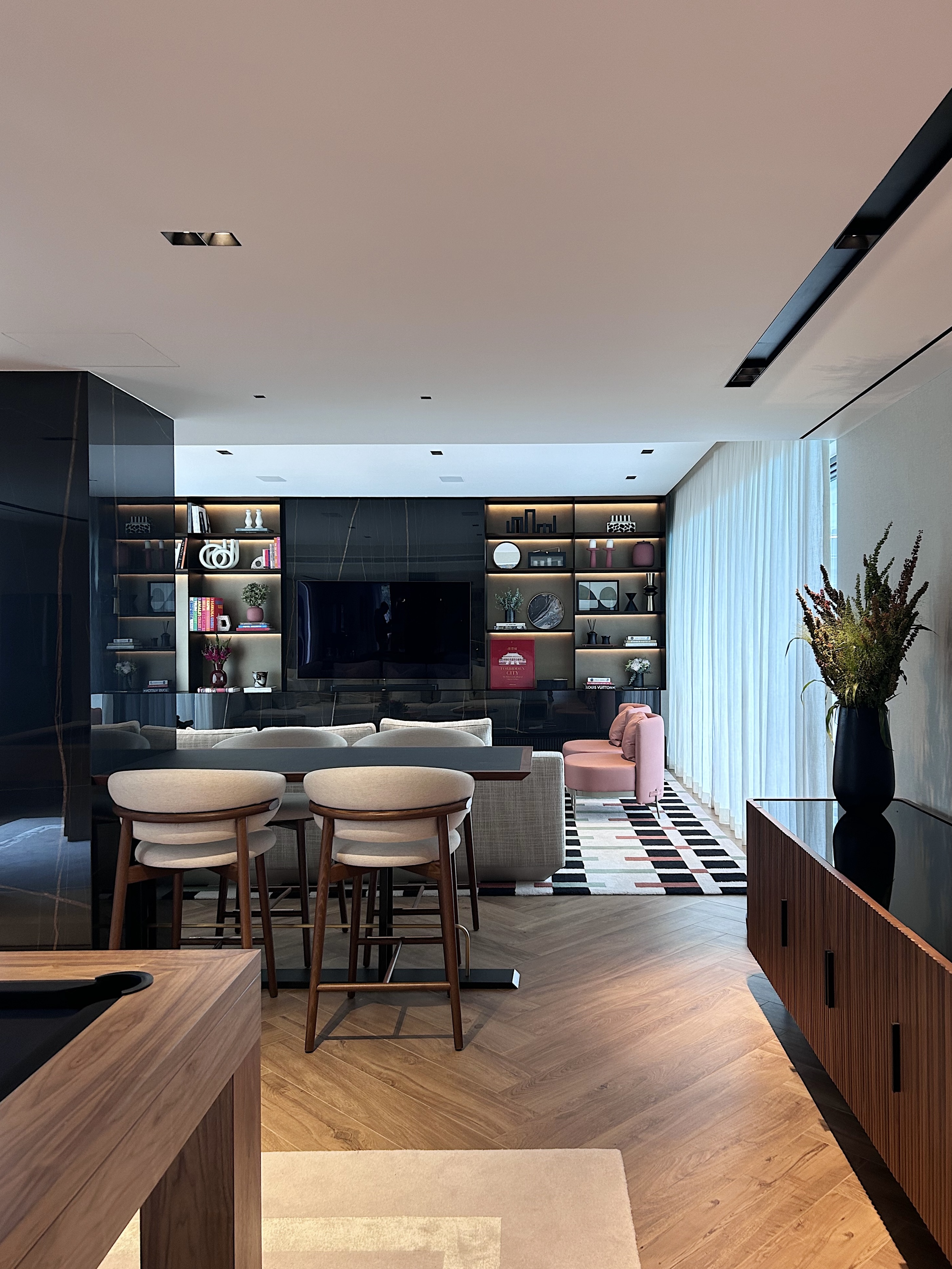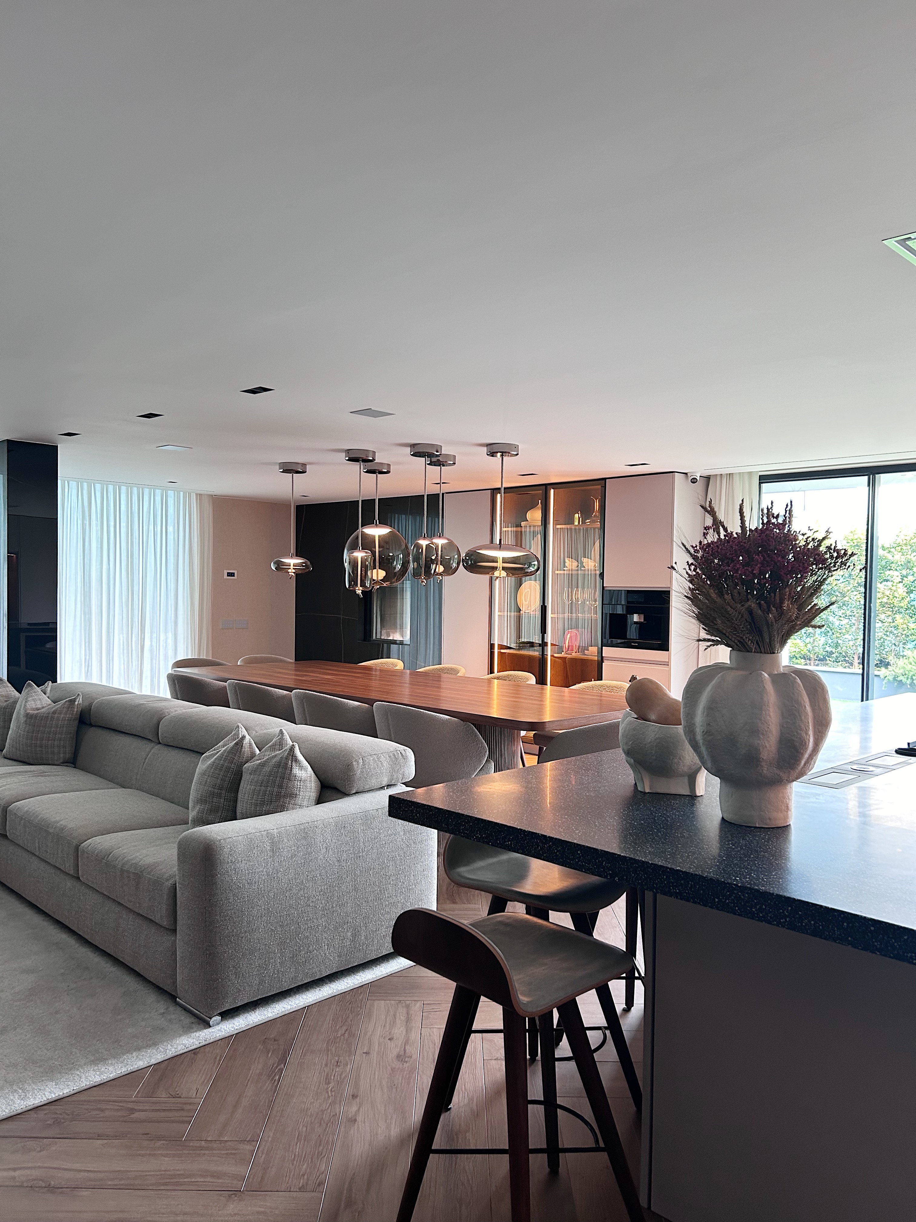 Este projeto residencial foi pensado para oferecer o equilíbrio perfeito entre conforto, funcionalidade e elegância. Os interiores revelam uma estética actual, com um design que privilegia linhas simples, materiais de elevada qualidade e uma paleta de cores sóbria e discreta. Os espaços são amplos e acolhedores, com especial atenção aos detalhes decorativos que lhes conferem um toque personalizado e único. A integração harmoniosa de elementos naturais, como a madeira e a pedra, cria um equilíbrio entre tradição e modernidade. A iluminação foi cuidadosamente estudada para valorizar texturas e materiais, resultando em ambientes convidativos e ajustados às necessidades da família. As zonas sociais promovem a convivência natural, através de áreas interligadas que favorecem a funcionalidade e o bem-estar. A cozinha, de desenho elegante, foi concebida como um espaço que combina praticidade e momentos de partilha. A sala, cheia de personalidade e marcada por peças de design, alia conforto a uma linguagem contemporânea. A seleção criteriosa do mobiliário e dos objetos decorativos reforça a ideia de um lar único, onde cada detalhe reflete a identidade e o estilo de vida dos seus habitantes. Trata-se de um projeto que ultrapassa tendências, oferecendo um refúgio moderno e acolhedor para a vida em família.