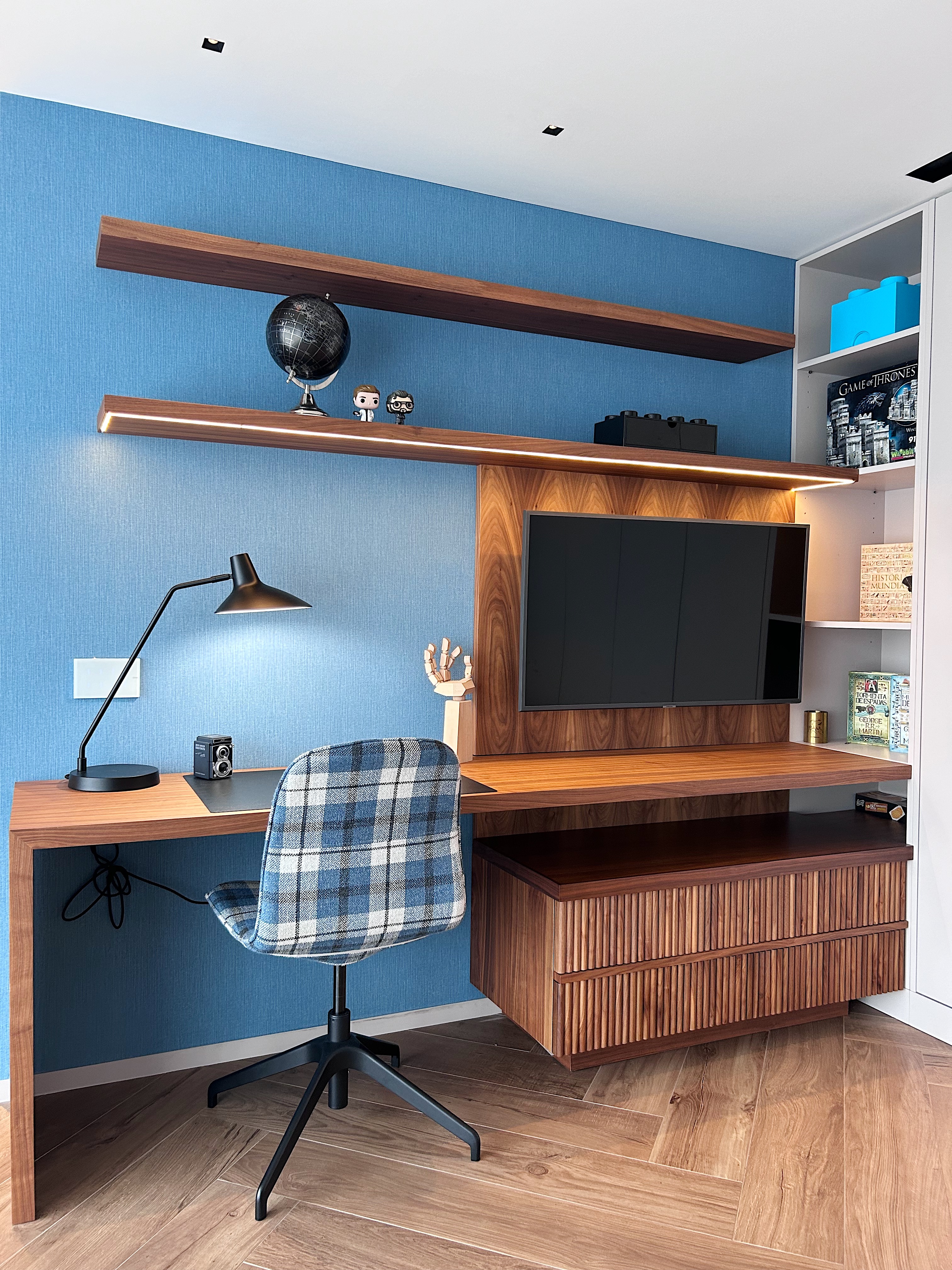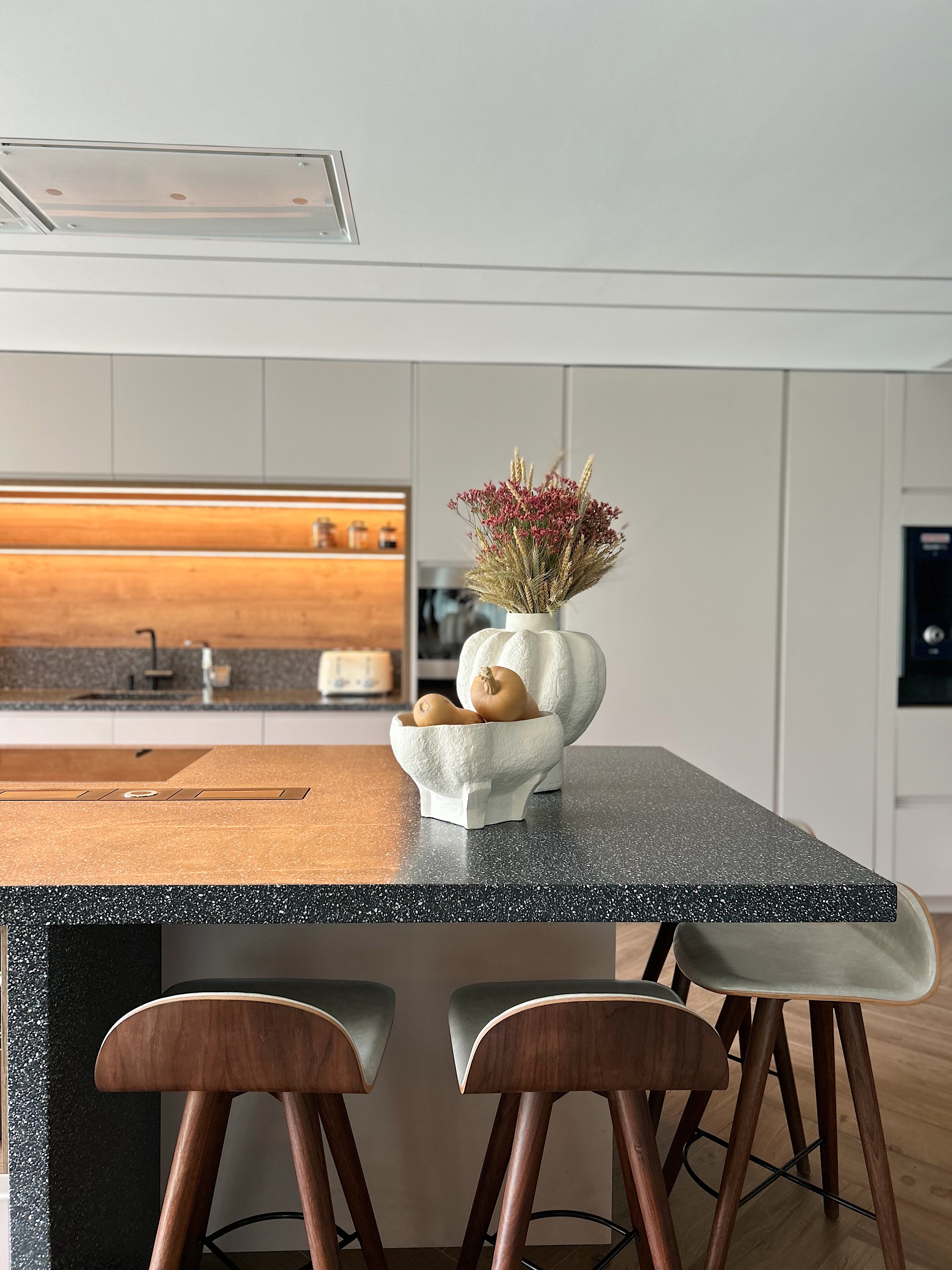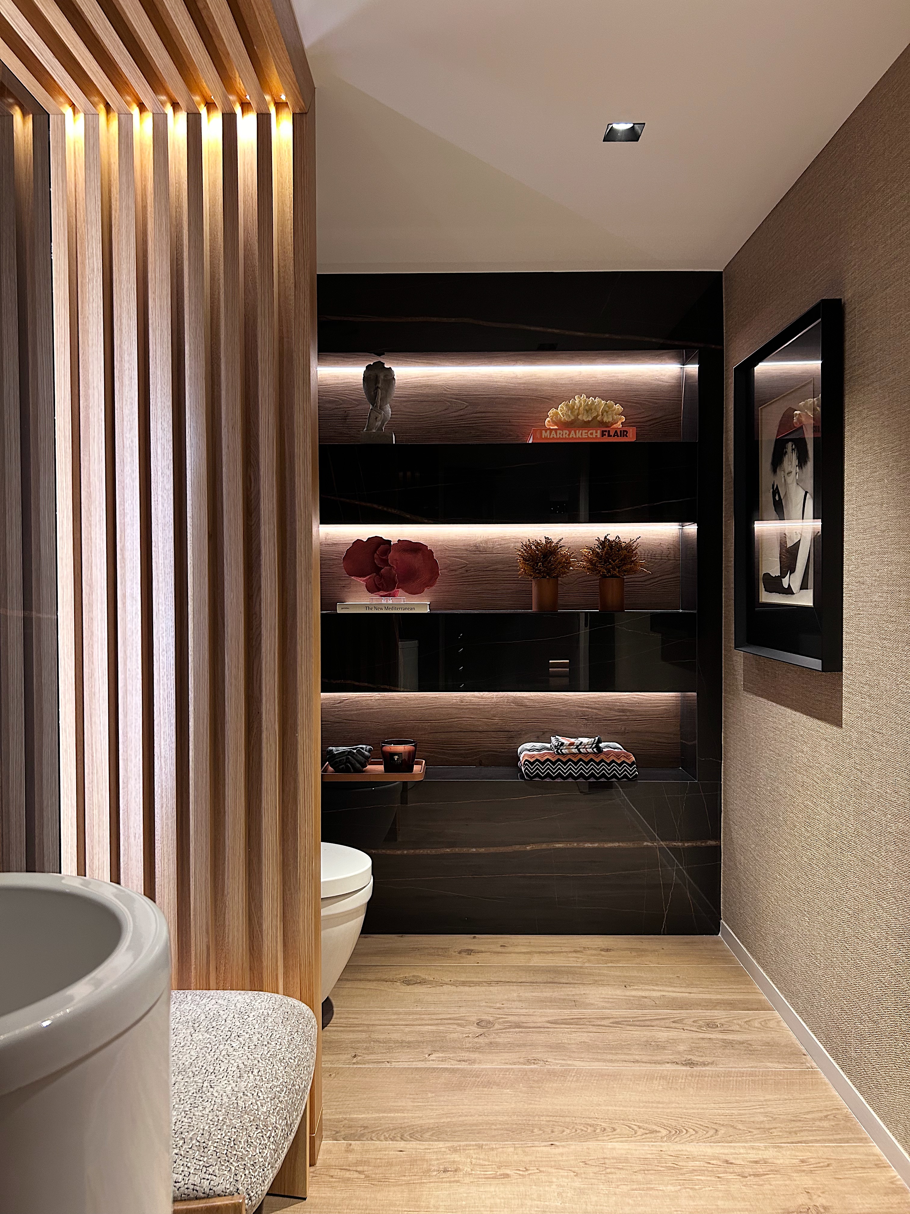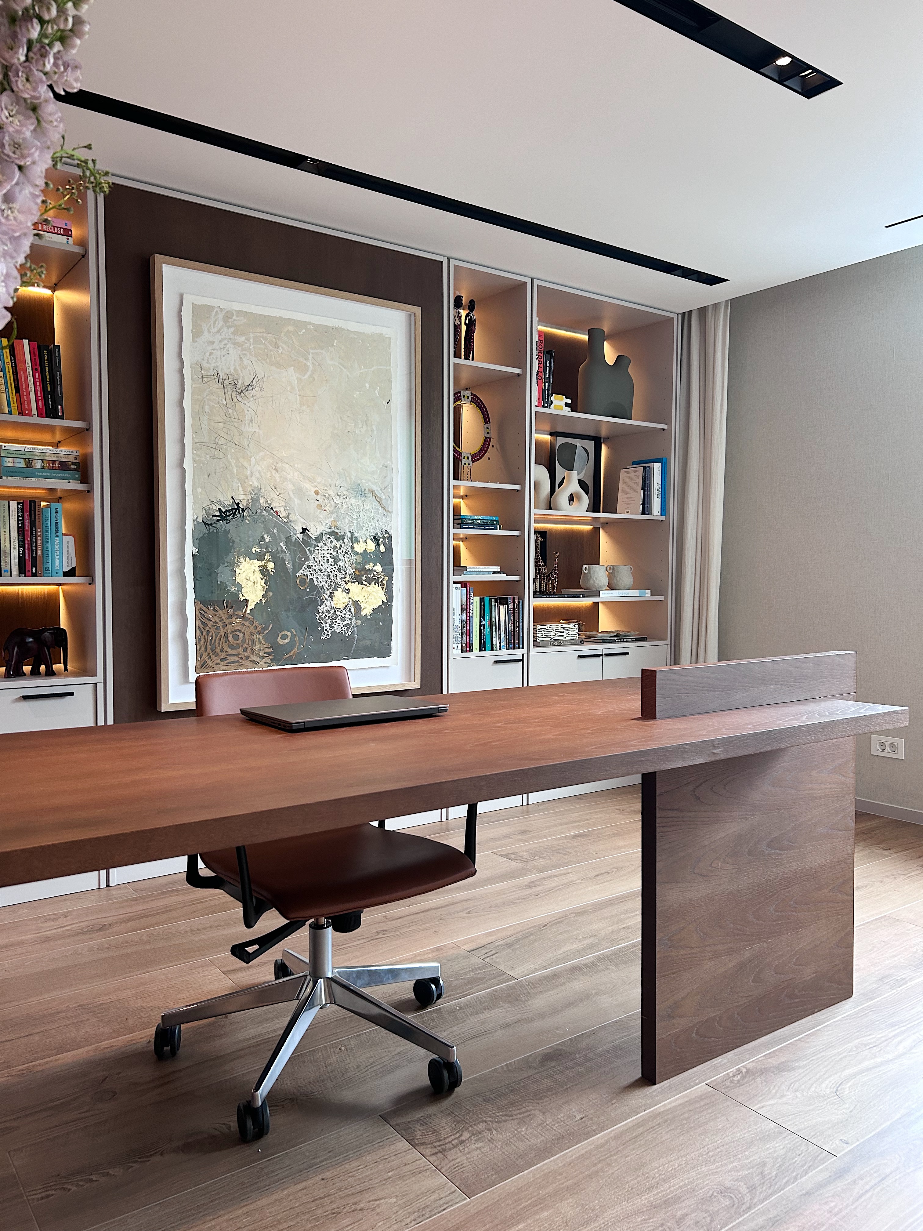 Este projeto residencial foi pensado para oferecer o equilíbrio perfeito entre conforto, funcionalidade e elegância. Os interiores revelam uma estética actual, com um design que privilegia linhas simples, materiais de elevada qualidade e uma paleta de cores sóbria e discreta. Os espaços são amplos e acolhedores, com especial atenção aos detalhes decorativos que lhes conferem um toque personalizado e único. A integração harmoniosa de elementos naturais, como a madeira e a pedra, cria um equilíbrio entre tradição e modernidade. A iluminação foi cuidadosamente estudada para valorizar texturas e materiais, resultando em ambientes convidativos e ajustados às necessidades da família. As zonas sociais promovem a convivência natural, através de áreas interligadas que favorecem a funcionalidade e o bem-estar. A cozinha, de desenho elegante, foi concebida como um espaço que combina praticidade e momentos de partilha. A sala, cheia de personalidade e marcada por peças de design, alia conforto a uma linguagem contemporânea. A seleção criteriosa do mobiliário e dos objetos decorativos reforça a ideia de um lar único, onde cada detalhe reflete a identidade e o estilo de vida dos seus habitantes. Trata-se de um projeto que ultrapassa tendências, oferecendo um refúgio moderno e acolhedor para a vida em família.
